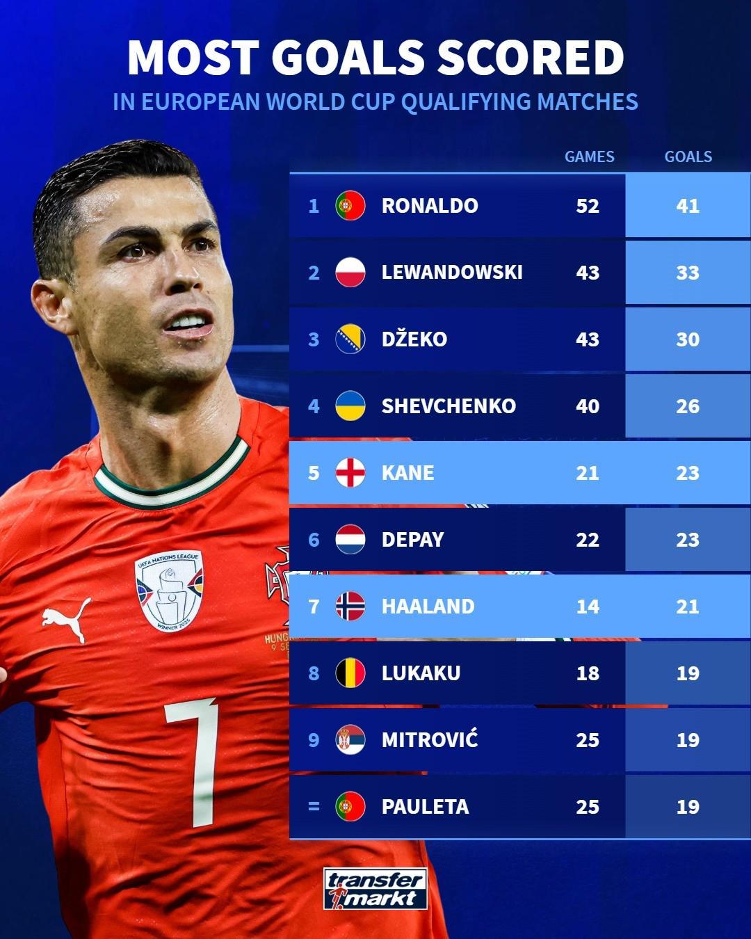 德国转会市场网站列出了欧洲区世预赛历史射手榜,C罗以41球居首,凯恩以23球排名第五,哈兰德以21球位列第七。